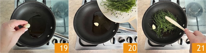 Um die Agretti in der Pfanne zu kochen, schälen Sie eine Knoblauchzehe und legen Sie sie mit einem Schuss Öl in die Pfanne 19. Lassen Sie sie goldbraun werden und fügen Sie die bereits gereinigten Agretti hinzu 20. Mischen Sie, um sie zu würzen 21.