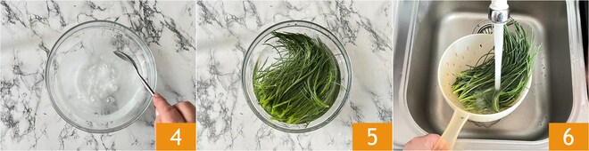 Vermischen Sie es 4 und legen Sie die Agretti hinein 5. Wechseln Sie das Wasser 1-2 Mal, bis das Wasser in der Schüssel sauber ist. Spülen Sie sie dann unter fließendem Wasser ab 6 und verwenden Sie sie für Ihre Rezepte.