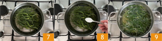 Um die Agretti zu kochen, füllen Sie einen Topf mit Wasser, fügen Sie die zuvor gereinigten Agretti hinzu und stellen Sie ihn auf den Herd 7. Geben Sie das Salz hinzu 8 und lassen Sie sie 5 Minuten ab dem Siedepunkt kochen 9.