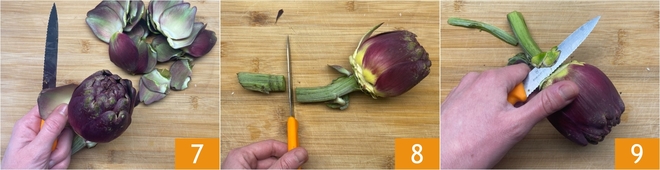 Falls Sie den Stiel dran gelassen haben, schälen Sie die äußere Schicht 10. Um den oberen Teil der Blätter zu entfernen, machen Sie einen spiralförmigen Schnitt, indem Sie das Messer schräg halten und von der Mitte der Artischocke ausgehend schneiden 11. Sie sollten die Form einer Knospe erhalten 12.