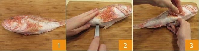 Um den Drachenkopf zu reinigen 1, öffnen Sie ihn zunächst, indem Sie den Bauch mit einem Messer einschneiden: Beginnen Sie am Kopf entlang seiner gesamten Länge bis zur Schwanzflosse 2, wobei Sie darauf achten, das Fleisch nicht zu beschädigen, und entfernen Sie dann die Innereien 3.