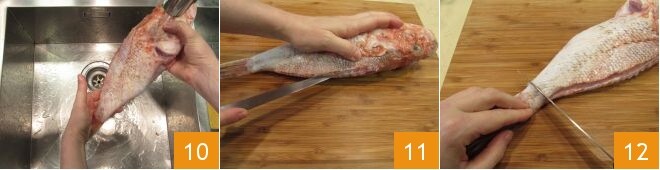 Spülen Sie ihn anschließend gründlich unter fließendem Wasser ab, um eventuell verbliebene Schuppen zu entfernen 10, schneiden Sie mit einem scharfen Messer entlang des Rückens 11 und machen Sie einen Einschnitt in der Nähe der Schwanzflosse 12, um das Filetieren des Drachenkopfs zu erleichtern.