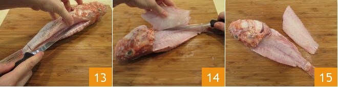 Beginnen Sie mit dem Filetieren, indem Sie den Drachenkopf mit den Händen öffnen, während Sie die Klinge 13 entlangführen, um das erste Filet 14 abzutrennen, und legen Sie es beiseite 15 für eventuelle Zubereitungen. Verfahren Sie auf dieselbe Weise auch für die andere Seite. Auf diese Weise erhalten Sie die Drachenkopffilets, die für Ihre Zubereitungen nützlich sind. Falls erforderlich, können Sie die Haut entfernen, indem Sie sie mit einem scharfen Messer entlang des Filets zwischen Haut und Fleisch abziehen.