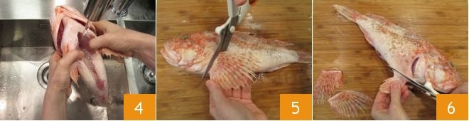 Nachdem Sie die Innereien entfernt haben, spülen Sie den Drachenkopf gründlich unter fließendem Wasser ab 4, um eventuell verbliebene Rückstände zu entfernen. Schneiden Sie alle Flossen ab: Mit einer Schere schneiden Sie die Brustflosse 5, die Bauchflosse 6,