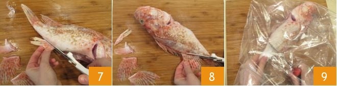 die untere Bauchflosse 7 und die Rückenflosse 8. Schuppen Sie ihn dann mit einem Messer von der Schwanzflosse bis zum Kopf, wobei Sie ihn in einem Plastikbeutel 9 einstecken, um das Verteilen der Schuppen zu vermeiden.