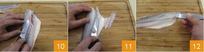 Entfernen Sie mit einem kleinen Messer die rötlichen Adern in der Mitte jedes Filets 10. Entfernen Sie nun vorsichtig die sichtbaren Gräten im Bauch des Fisches mit einem Messer 11, ohne das Fleisch zu beschädigen. Fahren Sie fort, die restlichen Gräten mit einer speziellen Pinzette zu entfernen 12. Ihre Goldbrassenfilets sind nun bereit zur Verwendung.