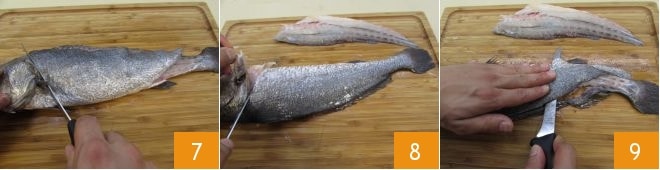 Fahren Sie dann fort, das Filet vom Kopf des Tieres zu trennen 7, indem Sie einen geraden Schnitt in Höhe der Kiemen machen. Für diese Operation ist es ratsam, das Messer leicht zu neigen 8. Gehen Sie dann auf die andere Seite des Fisches, um die zweite Hälfte des Filets zu erhalten, indem Sie das Fleisch von der Gräte trennen 9.