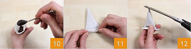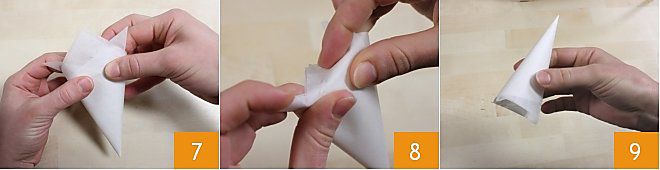 Sie werden einen Kegel mit 3 nach oben gerichteten Spitzen haben 7: Folgen Sie deren Richtung und falten Sie die Spitzen in den Kegel 8. Ihr Hörnchen ist bereit, gefüllt zu werden 9.