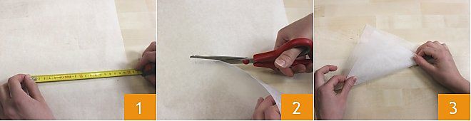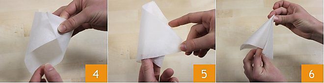 Vereinigen Sie die beiden Ecken der Basis 4, überlappen Sie sie, rollen Sie die Enden des Backpapiers auf sich selbst 5 und schließen Sie es zu einem Kegel (die Spitze muss aus der Basis des Dreiecks geformt werden) 6.