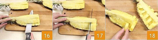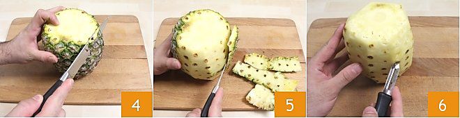 Nun sehen wir, wie man die Ananas schneiden kann: Sobald der beschriebene Vorgang abgeschlossen ist, schneiden Sie die Ananas längs in zwei Hälften und formen Sie 4 Spalten 7. Nehmen Sie dann jede einzelne Spalte und entfernen Sie den holzigen inneren Teil 8. Schneiden Sie jede Spalte in Scheiben der Dicke, die Sie bevorzugen, je nach dem Rezept, das Sie zubereiten werden 9.