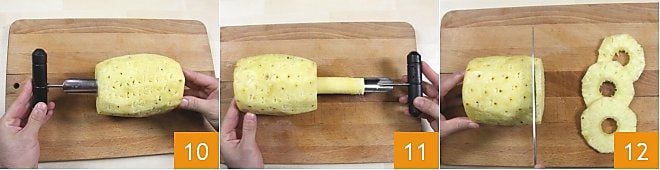 Sie können die Ananas auch in runde Scheiben schneiden: Nachdem Sie sie gereinigt und die Schale und die braunen Stiele entfernt haben, besorgen Sie sich einen Apfelentkerner: Führen Sie ihn von einem Ende her in die Mitte der Ananas ein 10, sobald Sie die Hälfte der Länge der Frucht erreicht haben, ziehen Sie den Entkerner heraus und wiederholen Sie den Vorgang von dem gegenüberliegenden Ende 11. Sobald der mittlere Teil entfernt ist, können Sie die Frucht in Scheiben der gewünschten Dicke schneiden 12.