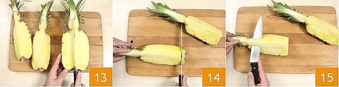 Dann gibt es den Boot-Schnitt: Schneiden Sie die Ananas in zwei Hälften, ohne sie zu schälen, und lassen Sie den Schopf dran. Teilen Sie dann jede Hälfte in 2 weitere Spalten, bis Sie 4 erhalten 13 und entfernen Sie bei jeder die untere Seite ohne den Schopf 14. Nun schneiden Sie mit einem scharfen Messer den holzigen Abschnitt ab, achten Sie jedoch darauf, ihn am Ende mit dem Schopf befestigt zu lassen 15.