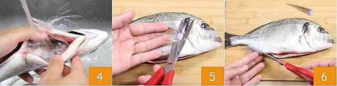 Waschen Sie den Bauch des Fisches gründlich unter fließendem Wasser, um alle Blutspuren zu entfernen 4. Entfernen Sie nun die Flossen: Schneiden Sie zuerst mit der Schere die Seitenflosse, die sich in der Nähe des Kopfes befindet 5, dann schneiden Sie die Flosse unter dem Bauch 6