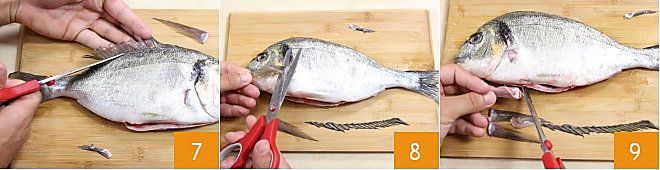 und die Rückenflosse 7. Drehen Sie den Fisch auf die andere Seite und entfernen Sie die andere Seitenflosse 8 und die Schwanzflosse 9.