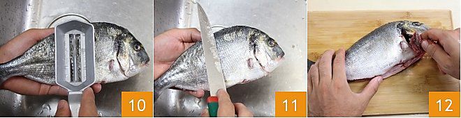 Mit dem speziellen Entschupper 10 oder der Klinge eines Messers 11 entschuppen Sie die Dorade sorgfältig, indem Sie das Werkzeug wiederholt vom Schwanz zum Kopf führen (wir empfehlen, diesen Vorgang unter fließendem Wasser durchzuführen oder den Fisch in einen Beutel zu legen, um zu verhindern, dass die Schuppen herumfliegen). Spülen Sie die Dorade unter fließendem Wasser ab und waschen Sie sie auch außen gründlich. Wenn Sie den Fisch ganz, im Ofen oder auf dem Grill, kochen möchten, ist die Reinigung hier beendet und die Dorade ist bereit, gewürzt und gekocht zu werden. Wenn Sie jedoch Doradenfilets benötigen, legen Sie die Dorade auf das Schneidebrett und entfernen Sie die Kiemen (unter den beiden halbkreisförmigen Öffnungen an den Seiten des Kopfes), indem Sie sie manuell herausziehen 12.