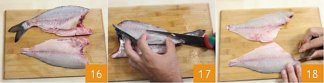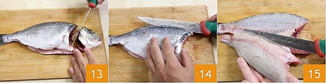 Schneiden Sie mit dem Fischfiletiermesser den Kopf ab 13, dann schneiden Sie den Schwanz und den Rücken des Fisches entlang der Wirbelsäule 14, beginnend von oben, und führen Sie die Klinge horizontal zur Arbeitsfläche, um das erste Filet zu erhalten 15.