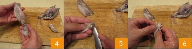 Dann ziehen Sie die Innereien des Tintenfisches heraus 4 und spülen Sie ihn ab. Nehmen Sie nun den Kopf des Fisches wieder auf. Halten Sie ihn mit zwei Fingerspitzen fest und schneiden Sie mit einem Messer den Umriss der Augen ein 5 und drücken Sie den unteren Teil der Augen heraus, um sie zu entfernen. Suchen Sie auch den Schnabel, der sich in der Mitte der Tentakel befindet 6, und drücken Sie ihn nach außen.