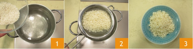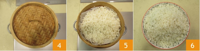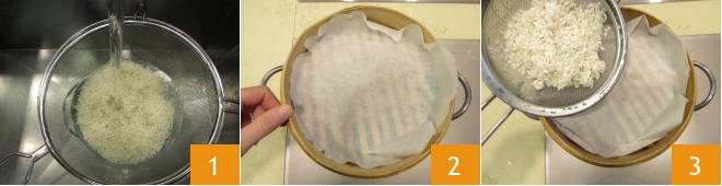 Um den gedämpften Reis zuzubereiten, beginnen Sie damit, einen Topf mit Wasser auf den Herd zu stellen und zum Kochen zu bringen. In der Zwischenzeit waschen Sie den Reis 1 und gießen ihn ab. Legen Sie ein Blatt Backpapier in den Dampfgarer 2 und stellen ihn auf den Topf. Dann geben Sie den Reis hinein 3 und verteilen ihn auf der gesamten Oberfläche.