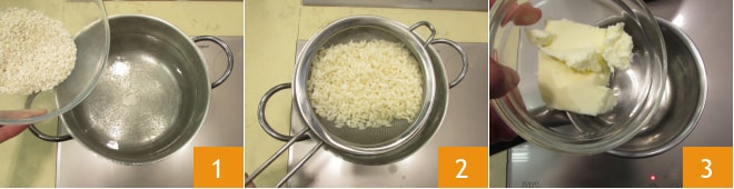 Um den Reis mit Butter und Parmigiano zuzubereiten, beginnen Sie damit, den Reis in kochendem und gesalzenem Wasser zu kochen 1 und gießen ihn nach etwa 20 Minuten ab 2. In der Zwischenzeit geben Sie die Butter in einen kleinen Topf 3.