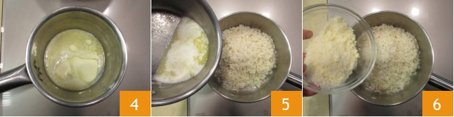 Schmelzen Sie sie bei sehr niedriger Hitze 4 und gießen Sie sie, sobald sie geschmolzen ist, in den Topf mit dem abgegossenen Reis 5. Kochen Sie ihn bei niedriger Hitze kurz, bis die Butter absorbiert ist. Zu diesem Zeitpunkt geben Sie den geriebenen Parmigiano hinzu, lassen Sie etwas davon übrig 6.