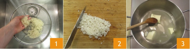 Um den Pilaw-Reis zuzubereiten, beginnen Sie damit, das Wasser in einem kleinen Topf zu erhitzen. Waschen Sie den Basmati-Reis unter fließendem Wasser 1. Gießen Sie ihn ab und schneiden Sie in der Zwischenzeit die Zwiebel klein 2. Dann schmelzen Sie die Butter in einem kleinen Topf bei niedriger Hitze, um sie nicht zu verbrennen 3.