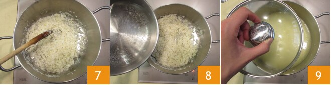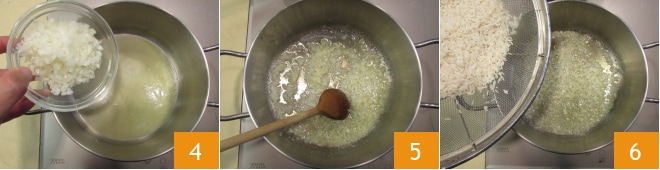 Fügen Sie die Zwiebel hinzu 4 und dünsten Sie sie einige Minuten, während Sie umrühren 5, bevor Sie den Reis hinzufügen 6.