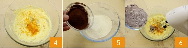 Fügen Sie die Schale einer unbehandelten Orange hinzu 4, dann Mehl und Kakao 5, sieben Sie sie und geben Sie sie zur Butter-Zucker-Creme 6. Arbeiten Sie die Mischung weiter, um den Kakao und das Mehl zu integrieren,