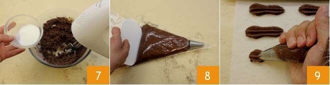 dann fügen Sie die Milch hinzu 7 und mischen weiter; Sie sollten einen Teig erhalten, der weder zu hart noch zu flüssig ist, mit einer buttrigen Konsistenz. Geben Sie es in einen Spritzbeutel mit einer ziemlich breiten Sterntülle 8; legen Sie ein Backpapier auf ein Backblech und beginnen Sie, 5-6 cm lange Kekse zu formen 9,