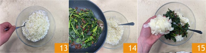 Mischen Sie 13, fügen Sie den gewürzten Rübstiel hinzu 14 und lassen Sie abkühlen. Fügen Sie nun auch den Ragusano Käse hinzu 15.