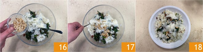 Kurz vor dem Servieren, die gerösteten Pinienkerne hinzufügen 16 und mischen 17. Hier ist Ihr winterlicher Reissalat mit Rübstiel und Ragusano 18 bereit!