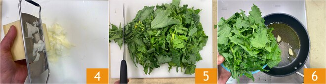 Weichen Sie die Rosinen etwa 10 Minuten ein. Schneiden Sie in der Zwischenzeit den Ragusano Käse in Scheiben 4 und putzen Sie den Rübstiel 5, waschen Sie ihn, tupfen Sie ihn ab und geben Sie ihn mit 2 ungeschälten Knoblauchzehen und einem Schuss Öl in die Pfanne 6.
