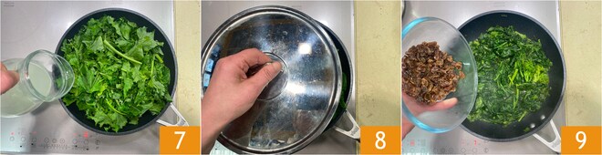Um sie optimal weich zu machen, können Sie mit ein paar Schöpflöffeln Reiswasser befeuchten 7, dann mit einem Deckel abdecken 8 und etwa 10 Minuten bei mittlerer Hitze kochen, dabei gelegentlich umrühren und kontrollieren. Sobald sie fertig sind, geben Sie die abgetropften Rosinen in die Pfanne mit dem Rübstiel 9.