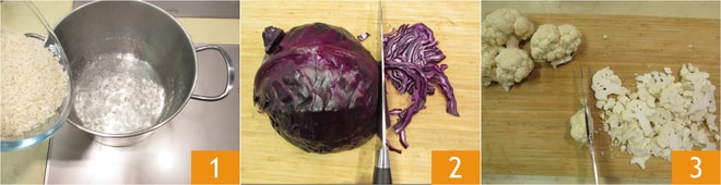 Um den winterlichen Reissalat zuzubereiten, bringen Sie das Wasser in einem Topf zum Kochen, dann salzen Sie es und kochen den Reis für die auf der Packung angegebene Zeit 1. Während der Reis kocht, waschen und bereiten Sie das Gemüse vor: Schneiden Sie den Weißkohl in feine Streifen 2 und zerkleinern Sie die Blumenkohlröschen in kleine Stücke 3