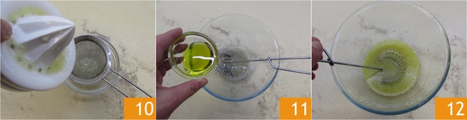 Filtern Sie den Saft 10 und geben Sie ihn in eine Schüssel 11, dann salzen, pfeffern und mischen Sie ihn 12. Füllen Sie die Citronette in eine Dressierflasche.