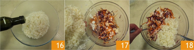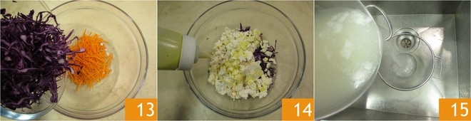 Geben Sie in eine große Schüssel die Karotten, den Weißkohl 13 und den Blumenkohl, dann würzen Sie mit der Citronette 14. Gießen Sie den Reis ab, der inzwischen gekocht ist 15