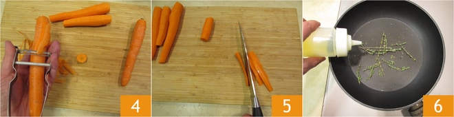 Schälen Sie nun mit einem Sparschäler die Karotten 4 und schneiden Sie sie in feine Streifen 5. Erhitzen Sie Öl und Thymian in einer Pfanne 6