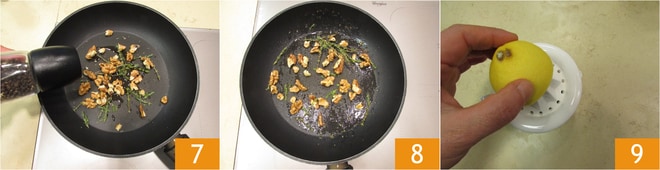 Pfeffern Sie 7 und rösten Sie die Nüsse für ein paar Minuten 8. Legen Sie die gerösteten Nüsse beiseite und bereiten Sie die Citronette vor: Pressen Sie den Zitronensaft aus 9.