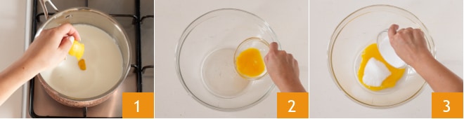 Um den Wirbelkuchen zu machen, beginnen Sie mit der Zubereitung der Creme: Erhitzen Sie die Milch in einem Topf mit Zitronenschale 1. In der Zwischenzeit geben Sie die Eigelbe 2 und den Zucker 3 in eine Schüssel.