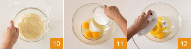 Dann geben Sie die Creme in eine Schüssel, decken Sie sie mit Frischhaltefolie ab 10 und lassen Sie sie abkühlen, zuerst bei Raumtemperatur und dann im Kühlschrank. Bereiten Sie nun den Kuchen zu: Geben Sie die Eier mit dem Zucker 11 in eine Schüssel, fügen Sie die Vanilleschotenkerne hinzu und schlagen Sie sie mit einem elektrischen Mixer 12, bis sie aufgebläht und schaumig sind.
