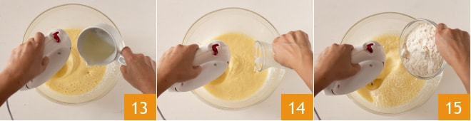 Fügen Sie das Öl langsam hinzu 13, die Milch 14 und schließlich das Mehl und das Backpulver 15.