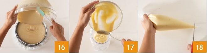 Gießen Sie den Teig in eine 22 cm Springform, die vorher eingefettet und bemehlt oder mit Backpapier ausgelegt wurde 16; glätten Sie ihn bei Bedarf mit einem Spatel. Nehmen Sie die bereits vollständig abgekühlte Creme und geben Sie sie in einen Spritzbeutel 17 ohne Tülle 18.