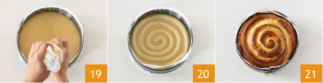 Erstellen Sie eine Spirale auf dem Teig 19, beginnend in der Mitte des Kuchens 20. Backen Sie bei 180 °C für ca. 35-40 Minuten. Sobald der Kuchen fertig gebacken ist, nehmen Sie ihn aus dem Ofen und lassen Sie ihn abkühlen, bevor Sie ihn servieren 21!