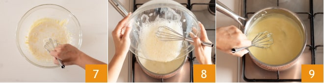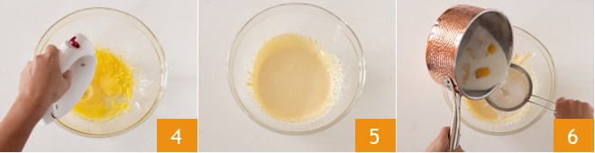 Schlagen Sie die Eigelbe mit dem Zucker 4 mit einem elektrischen Mixer, bis sie aufgebläht und schaumig sind 5. Fügen Sie nach und nach das gesiebte Mehl hinzu und mischen Sie es unter, dann gießen Sie langsam die heiße Milch hinzu, indem Sie sie durch ein Sieb gießen, um die Zitronenschale zurückzuhalten 6.