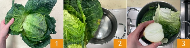 Um das Wirsing-Risotto mit Wurst zu zubereiten, bereiten Sie zunächst die Brühe vor, die Sie zum Kochen des Reises benötigen: Lösen Sie die äußeren Blätter des Wirsings 1 und geben Sie sie in einen Topf mit Wasser 2 zusammen mit einer halben Zwiebel 3, dann bringen Sie es bei mittlerer Hitze zum Kochen.