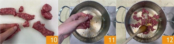 Entfernen Sie nun die Pelle von der Wurst und bröseln Sie sie mit den Händen 10. Legen Sie die Wurst in denselben Topf, in dem Sie den Wirsing gedünstet haben 11, und braten Sie sie bei hoher Hitze einige Minuten an, dabei häufig umrühren 12.