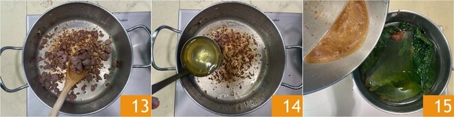 Nehmen Sie die angebratene Wurst aus der Pfanne 13 und stellen Sie sie beiseite, dann deglacieren Sie den Bratensatz mit einer Kelle heißer Brühe 14 und geben Sie die erhaltene Flüssigkeit in den Topf mit der Brühe, um sie weiter zu würzen 15.