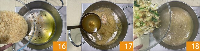 Erhitzen Sie nun in demselben Topf etwas Öl und rösten Sie den Reis für ein paar Minuten an 16, dann löschen Sie mit einer Kelle Brühe ab 17 und fügen den vorher gedünsteten Wirsing hinzu, wobei Sie etwas für die Dekoration beiseite lassen 18.