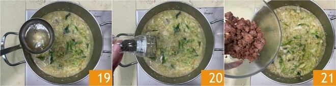 Kochen Sie den Reis weiter, indem Sie jeweils eine Kelle Brühe hinzufügen und sicherstellen, dass die vorherige absorbiert wurde 19. Würzen Sie mit Salz und Pfeffer 20. Am Ende der Kochzeit fügen Sie die Wurst hinzu, wobei Sie etwas für die Dekoration beiseite lassen 21.