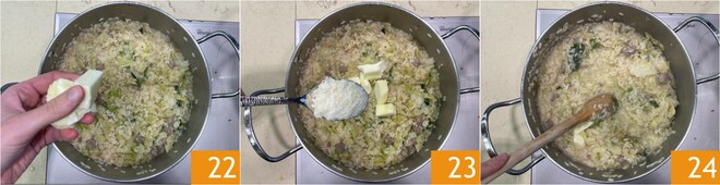 Schalten Sie die Hitze aus und rühren Sie Butter 22 und geriebenen Parmigiano Reggiano DOP 23 ein, dann gut umrühren, um zu vereinigen 24.