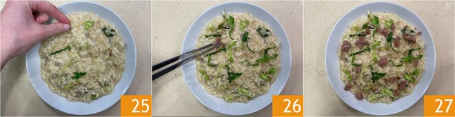 Servieren Sie und garnieren Sie mit dem beiseite gestellten Wirsing 25 und der Wurst 26. Servieren Sie Ihr Wirsing-Risotto mit Wurst sofort 27!